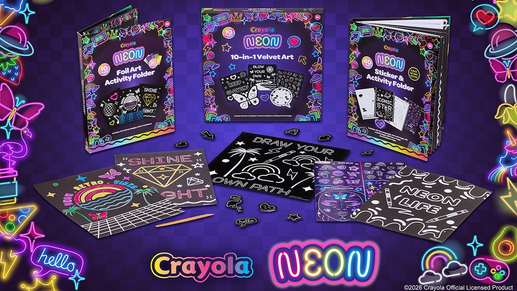 A mais recente novidade é a Crayola Neon, que chega este mês com uma linha de conjuntos que brilham no escuro e em cores neon. A linha inclui estojos de arte com folha, pastas de adesivos e conjuntos de caixas de arte em veludo, explorando as tendências de brincadeiras visuais e sensoriais que continuam a ressoar no corredor de artesanato.