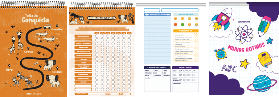 A coleção Animamente inclui a Caderneta de Rotina, com opções de checklist diário, semanal e mensal, incentiva o senso de responsabilidade e planejamento; o Caderno de Planejamento da Rotina, que contempla campos para o acompanhamento da saúde, higiene e sentimentos; e o Caderno Trilha da Conquista, que aplica uma metodologia de pontuação e recompensas para fortalecer o engajamento e a autoconfiança dos pequenos.