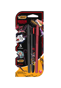 Embalagem com 1 unidades BIC 4 cores Stranger Things e 2 unidades BIC Cristal feito matte (Divulgação)
