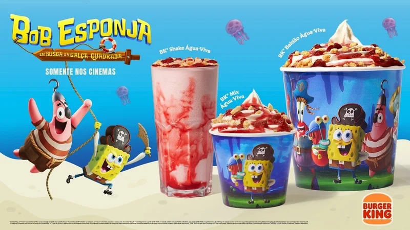 Para celebrar o lançamento do filme “Bob Esponja: Em Busca da Calça Quadrada”, o Burger King apresenta brinquedos exclusivos do Bob Esponja e seus amigos no Combo King Jr., disponíveis a partir de 10 de dezembro, juntamente com três sobremesas temáticas: BK Shake Água-Viva, BK Mix Água-Viva e BK Baldão Água-Viva.