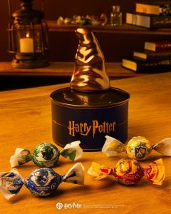 Inspirada no icônico Chapéu Seletor de Hogwarts, a lata traz oito trufas sortidas nos sabores pistache, torta de morango, baunilha e maracujá, representando as quatro das casas da escola.