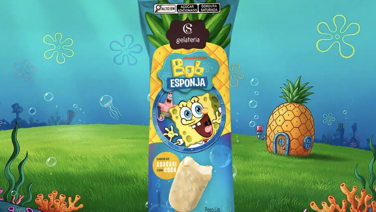 A Cacau Show lançou um novo picolé de Abacaxi com Coco inspirado no Bob Esponja, expandindo sua linha de produtos temáticos da Fenda do Biquíni. O picolé de 70g apresenta um creme sabor abacaxi com coco, cobertura de chocolate branco e embalagem com os personagens Bob Esponja e Patrick Estrela, além de ilustrações do fundo do mar e da casa do Bob Esponja.