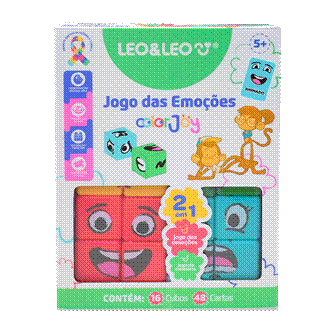 Jogo educativo com 16 cubos e 48 cartas que estimula o reconhecimento de expressões faciais, a percepção visual e habilidades socioemocionais de forma lúdica.