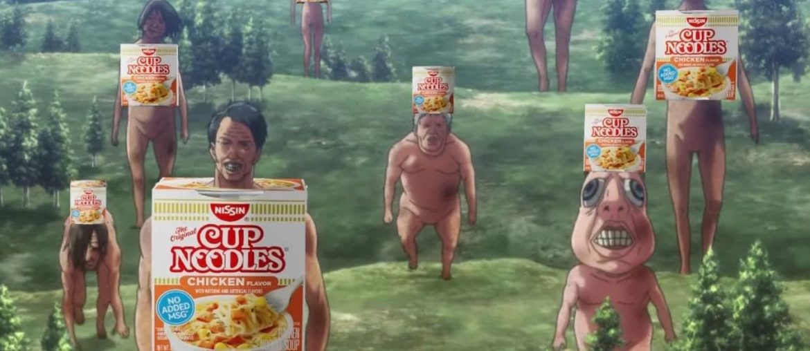 A Nissin, em colaboração com Attack on Titan, lançou um curta animado chamado Attack on Cup para apresentar a nova embalagem de copo de papel do Cup Noodles.