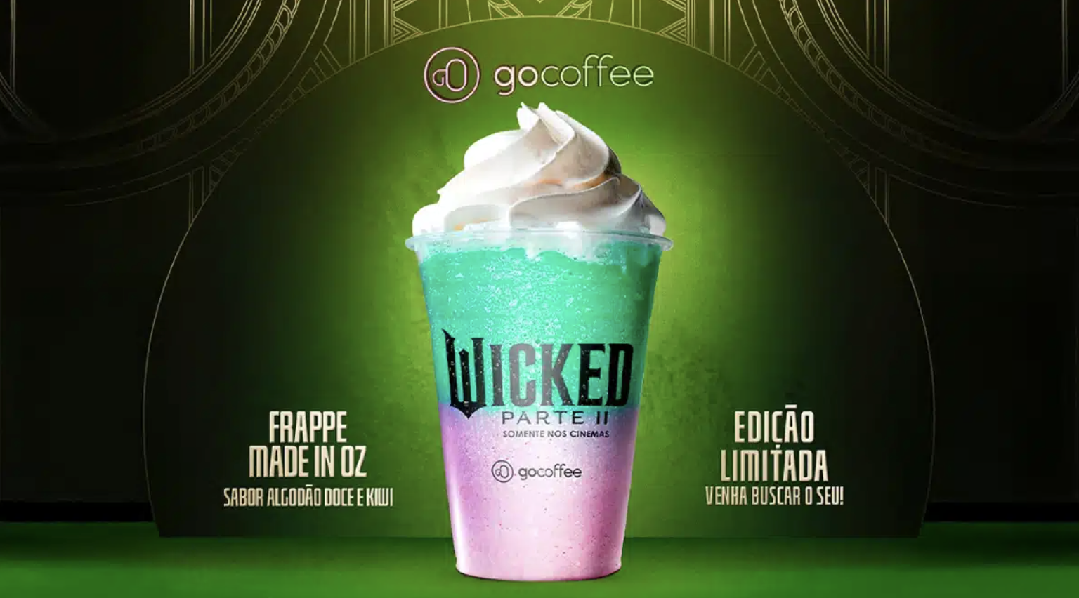 A Go Coffee, rede de cafeterias brasileira, lançou o ‘Frappe Made in Oz’ em edição limitada para celebrar o lançamento de Wicked: Parte ll, combinando os sabores de Kiwi (representando Elphaba) e Algodão Doce (simbolizando Glinda) em uma bebida que remete à estética visual do filme.