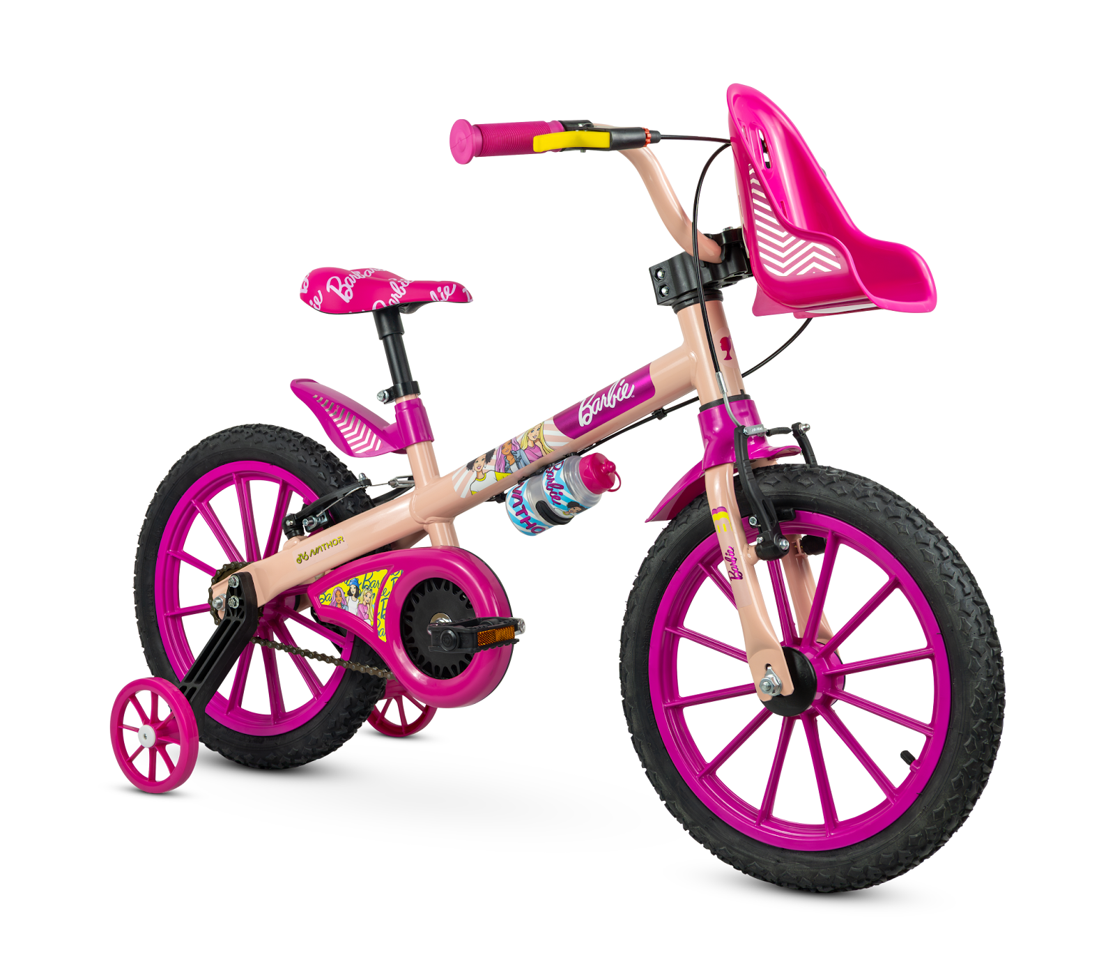 Para crianças a partir de 5 anos (1,10 m a 1,20 m), os modelos aro 16 trazem aro em ABS, rodinhas laterais removíveis e freio com maçaneta amarela para facilitar a identificação. A regulagem de ângulo do guidão permite ajustes que proporcionam mais conforto para a criança e acompanham seu crescimento. A versão Barbie também conta com suporte para boneca, reforçando a conexão afetiva com a personagem e estimulando ainda mais a imaginação durante as pedaladas.