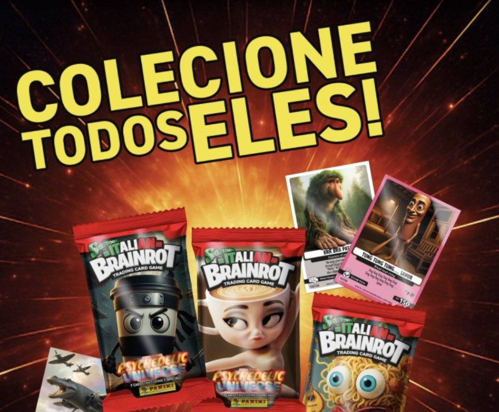 A coleção, já disponível online e em pontos de venda selecionados, apresenta 150 cards, incluindo cards base e especiais com acabamento holográfico, com o objetivo de combinar habilidades e colecionar personagens do universo Brainrot Italiano. Cada envelope contém 7 cartas, sendo 6 base e 1 especial.