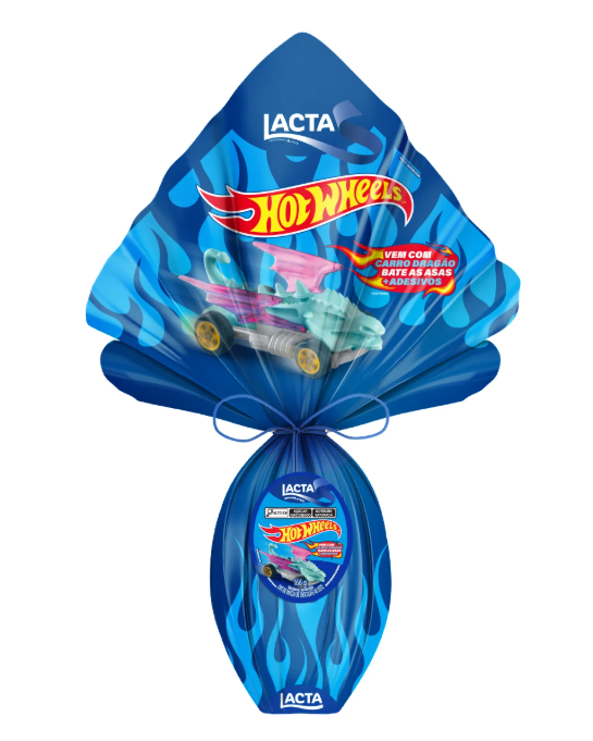 Também produzido pela Mondelez, o Ovo de Páscoa Lacta Hot Wheels acompanha um carrinho Dragão que bate as asas e uma cartela de adesivos para personalização. A combinação do chocolate ao leite Lacta com um presente radical transforma a data em uma experiência cheia de aventura e adrenalina.
