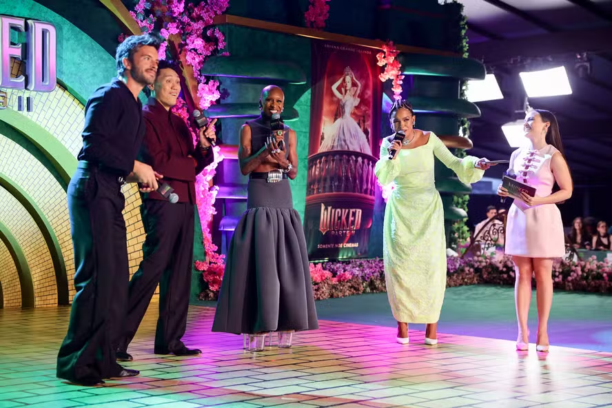 A ausência de Ariana Grande, intérprete de Glinda, virou motivo de brincadeira entre os fãs, que relembraram o meme de Lady Gaga ao dizer que “ela não vem mais!”. A diva pop gravou um vídeo pedindo desculpas por não ter conseguido viajar por conta de problemas no voo. Mesmo assim, o clima do evento permaneceu vibrante, impulsionado pela presença da protagonista Cynthia Erivo (Elphaba) e de Jonathan Bailey (Fiyero), eleito recentemente o “homem mais sexy do mundo” pela revista People.