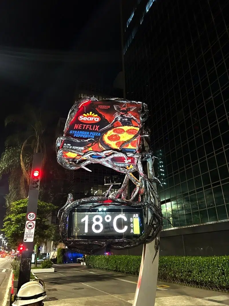 Quem passar pela Avenida Paulista até o dia 02 de dezembro verá um relógio de rua diferente, caracterizado com cenografia que remete a Stranger Things. A intervenção “estranha”, assim como a série, traz como protagonista um dos três produtos da linha especial da Seara, a Stranger Pizza Pepperoni. O portfólio também ganha visibilidade em outra ativação em São Paulo, na Avenida Faria Lima. Nesta segunda ação, que acontecerá até o dia 1º de dezembro, o público verá uma mídia OOH sequencial em telas sequenciais, com imagens dos produtos da Seara e algumas cenas que marcaram a série.
