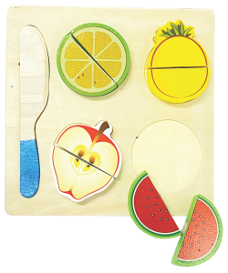 - Frutas para Corte com Faca de Madeira: conjunto lúdico que simula o corte de frutas, promovendo o jogo simbólico, a coordenação motora e o reconhecimento de alimentos.